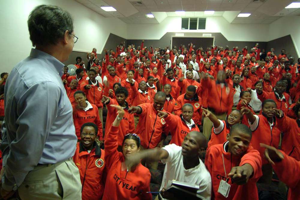 City Year es la iniciativa global de servicio a la comunidad de la Comunidad Democrática de Clinton (en inglés CDF), la cual inscribe a jóvenes del rango de 20 años en una amplia variedad de proyectos de mejoramiento de un año de duración. La presentación de Jóvenes por los Derechos Humanos fue parte de una sesión que duró todo un día de talleres de City Year que se llevaron a cabo en el remodelado distrito Art Center cerca del centro de Johannesburgo.