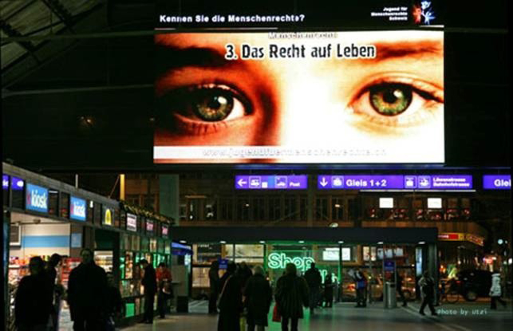 国連世界人権宣言の60周年を記念して、スイスの主要駅で4分ごとに30の人権広告がひとつ放映されました。これらの公共サービス広告はチューリッヒ、ベルン、ローザンヌ、ジュネーブなど主要駅の大型スクリーンで上映され、一日1500回視聴者に人権を知らしめました。